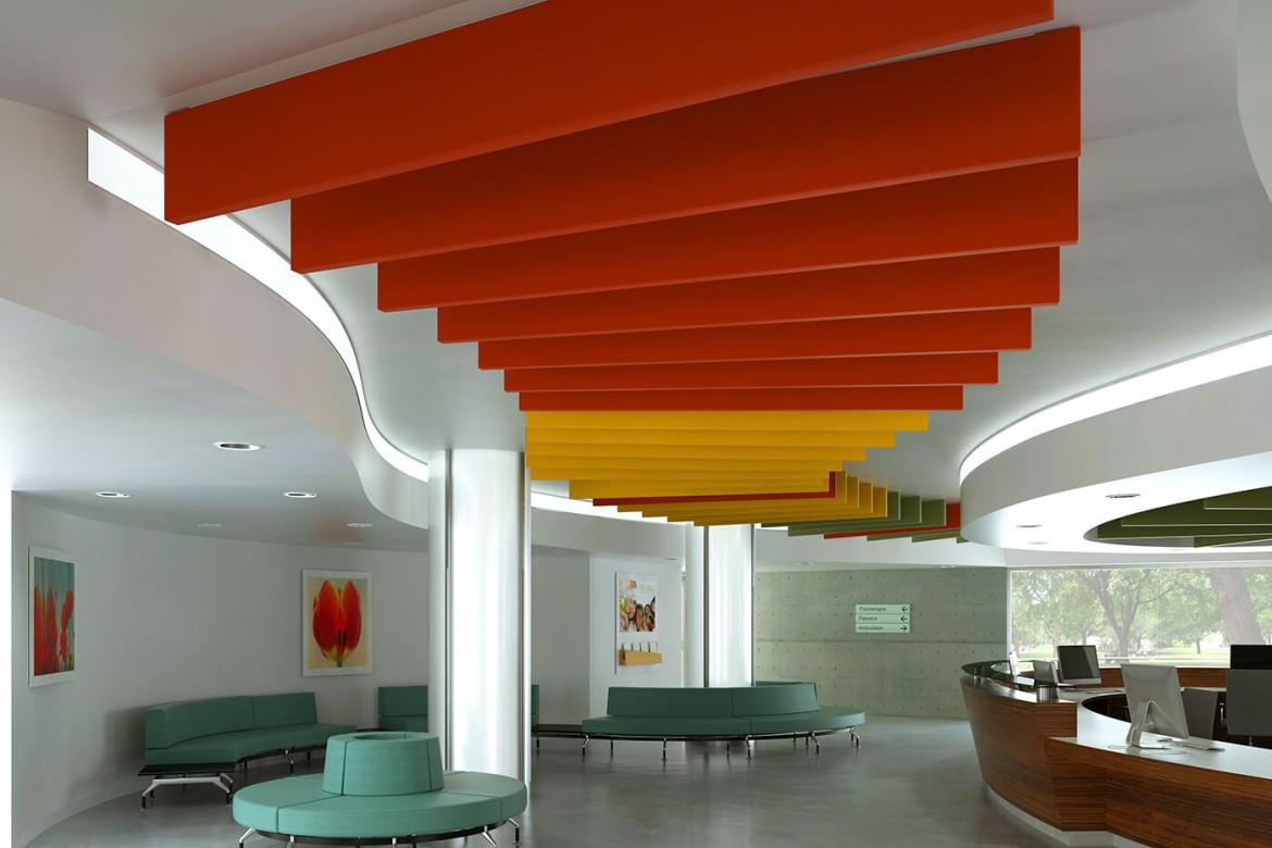 Акустикалық төбелер мен қабырға панельдері үшін бірегей шешім-бұл K&R Design инженерлері арнайы әзірлеген және кең түс схемасы бар бет. Осы факторлардың барлығы K&R Design өнімдеріне әртүрлі дизайн шешімдері үшін бірегей, тәуелсіз архитектуралық пішін береді. K&R design материалдары адам денсаулығы үшін мүмкіндігінше қауіпсіз, сонымен қатар адамның акустикалық денсаулығын қамтамасыз етеді. Акустикалық плиталардың алдыңғы жағы жарықты біркелкі шағылыстырады және жарқырамайды, сонымен қатар адамның көзіне жағымды әсер етеді, бөлмеде болу уақытының барлық кезеңінде шаршауды азайтады. Бірқатар арнайы өнімдерді әзірлеу кезінде 500-ден 4500 Гц-ке дейінгі жиілік диапазонында жүз пайыз дыбыс сіңіруге қол жеткізілді. Бұл кинотеатрлар, аудиториялар, сыныптар, Концерт залдары, көпфункционалды залдар және конференц-залдар сияқты ерекше акустикалық талаптары бар арнайы бөлмелер үшін өте маңызды.